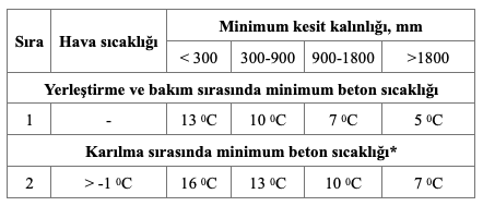 - 3 ila 7 gün boyunca beton sıcaklığını +10°C’nin üstünde tutmak için açık beton yüzeyleri odun talaşı, saman, cam yünü ve köpük levha gibi yalıtım örtüleri kullanılarak yalıtılmalı ya da çevresi kapatılmış ısıtma sistemleri kullanılmalı, daha sonra en az 4 gün daha beton sıcaklığının +5°C’nin üzerinde kalması sağlanmalı,